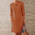 OVERVIEW Product VIEUNSTA Autumn Cotton Linen Dress 2019 Fashion Button O-Neck Knee Party Dress Women Long Sleeve Po